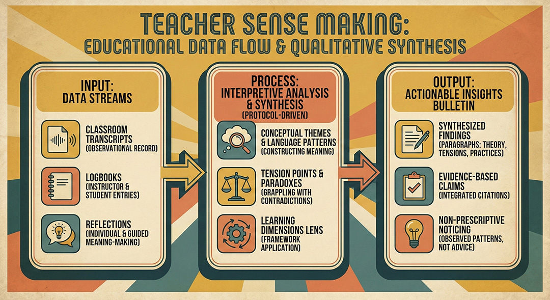We apply established analytical frameworks to code and interpret classroom discourse. This isn't surface-level sentiment analysis; it's systematic identification of communicative acts, reasoning chains, and moments of genuine interthinking—where participants are visibly constructing understanding together.